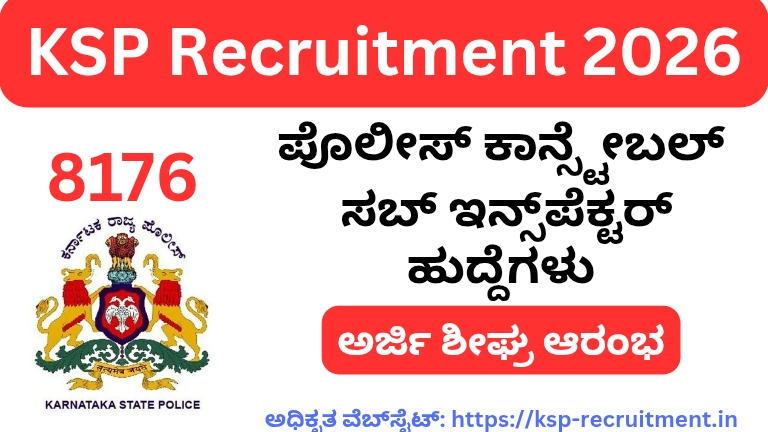 KSP Recruitment 2026: ಕರ್ನಾಟಕ ಪೊಲೀಸ್ ಇಲಾಖೆಯಲ್ಲಿ 8176 ಹುದ್ದೆಗಳು – ಕಾನ್ಸ್ಟೇಬಲ್ ಮತ್ತು ಸಬ್ ಇನ್ಸ್ಪೆಕ್ಟರ್ ನೇಮಕಾತಿ ಶೀಘ್ರ ಕರ್ನಾಟಕದಲ್ಲಿ ಸರ್ಕಾರಿ ಉದ್ಯೋಗದ ಕನಸು …